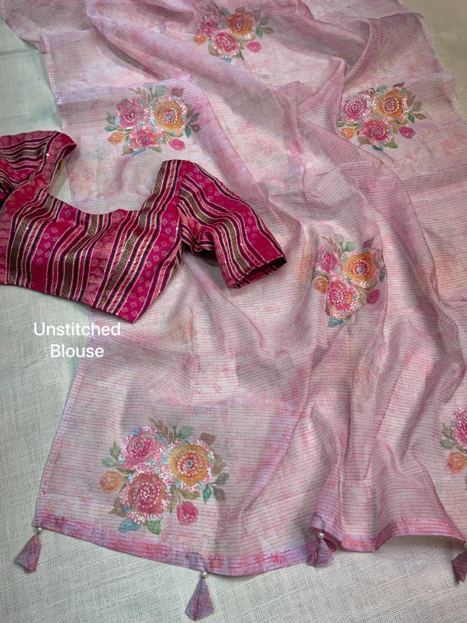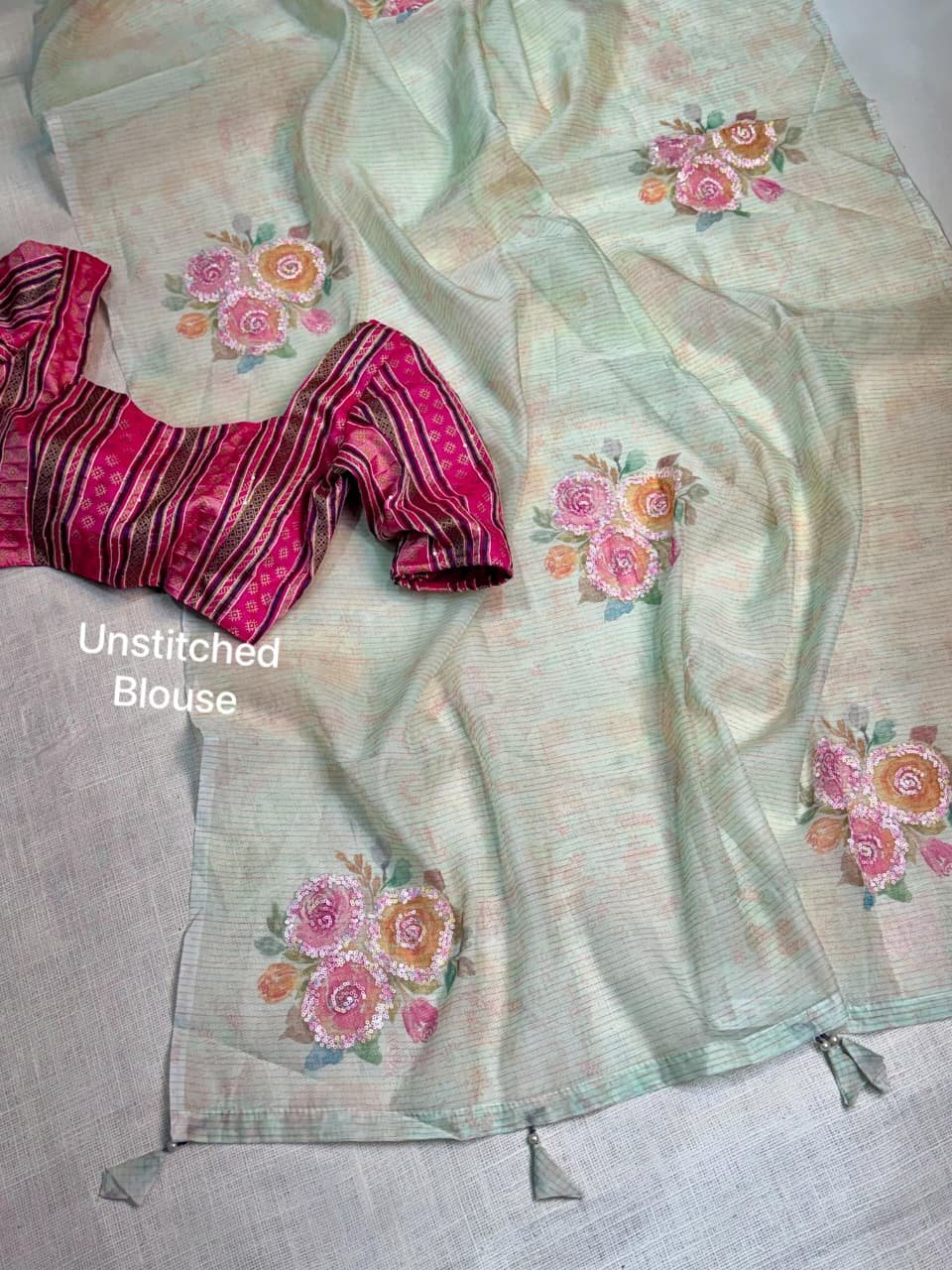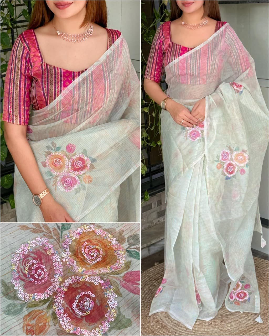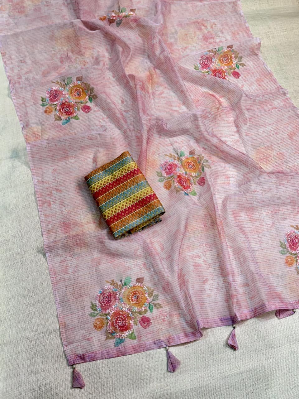 ILF Soft Organza Saree with 3D Floral Prints, Sequin Handwork & Minakari Blouse