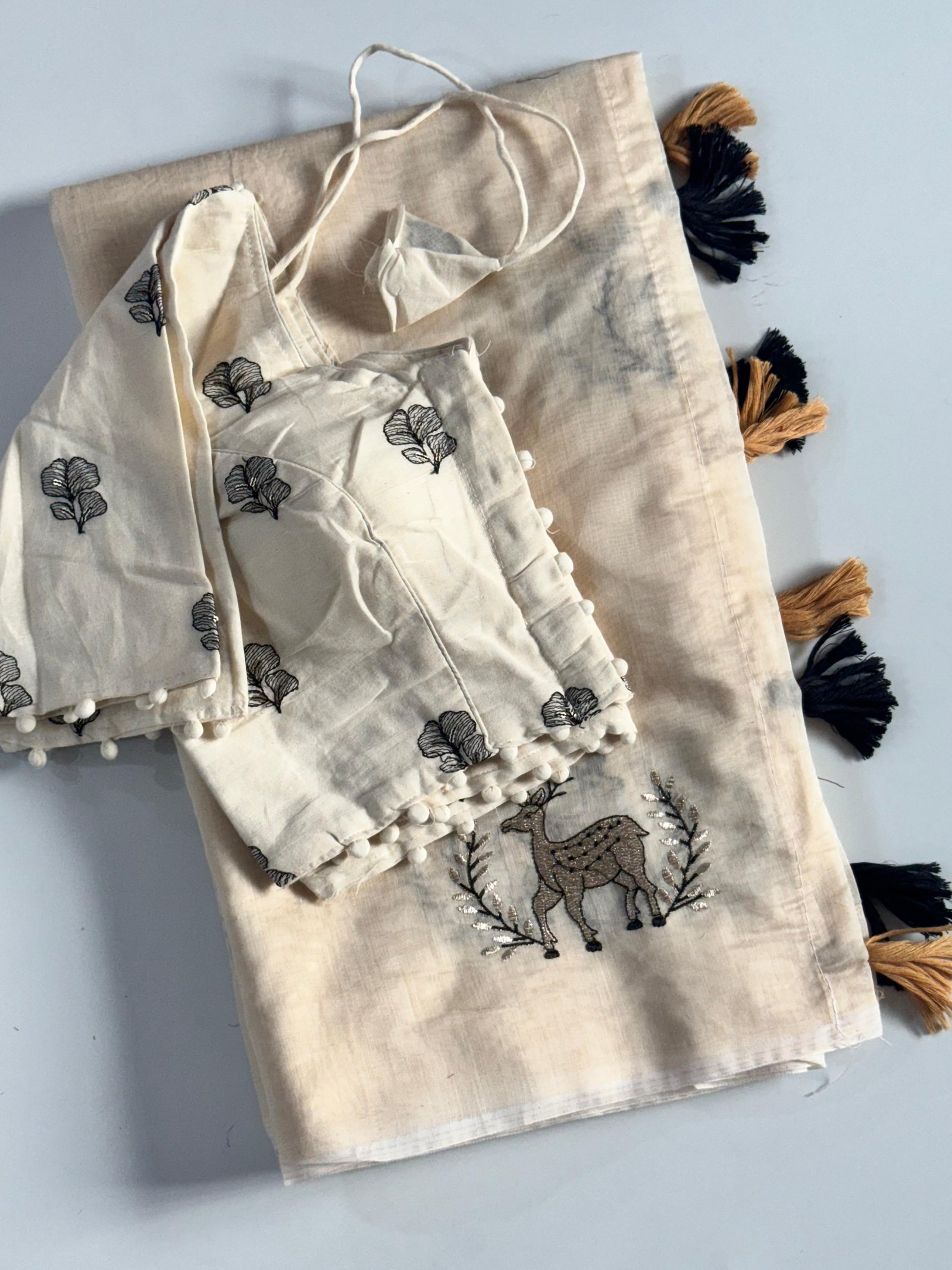 Blouse: Comes with a Pure Khadi stitched blouse featuring intricate floral embroidery and stylish pom-pom lace detailing.