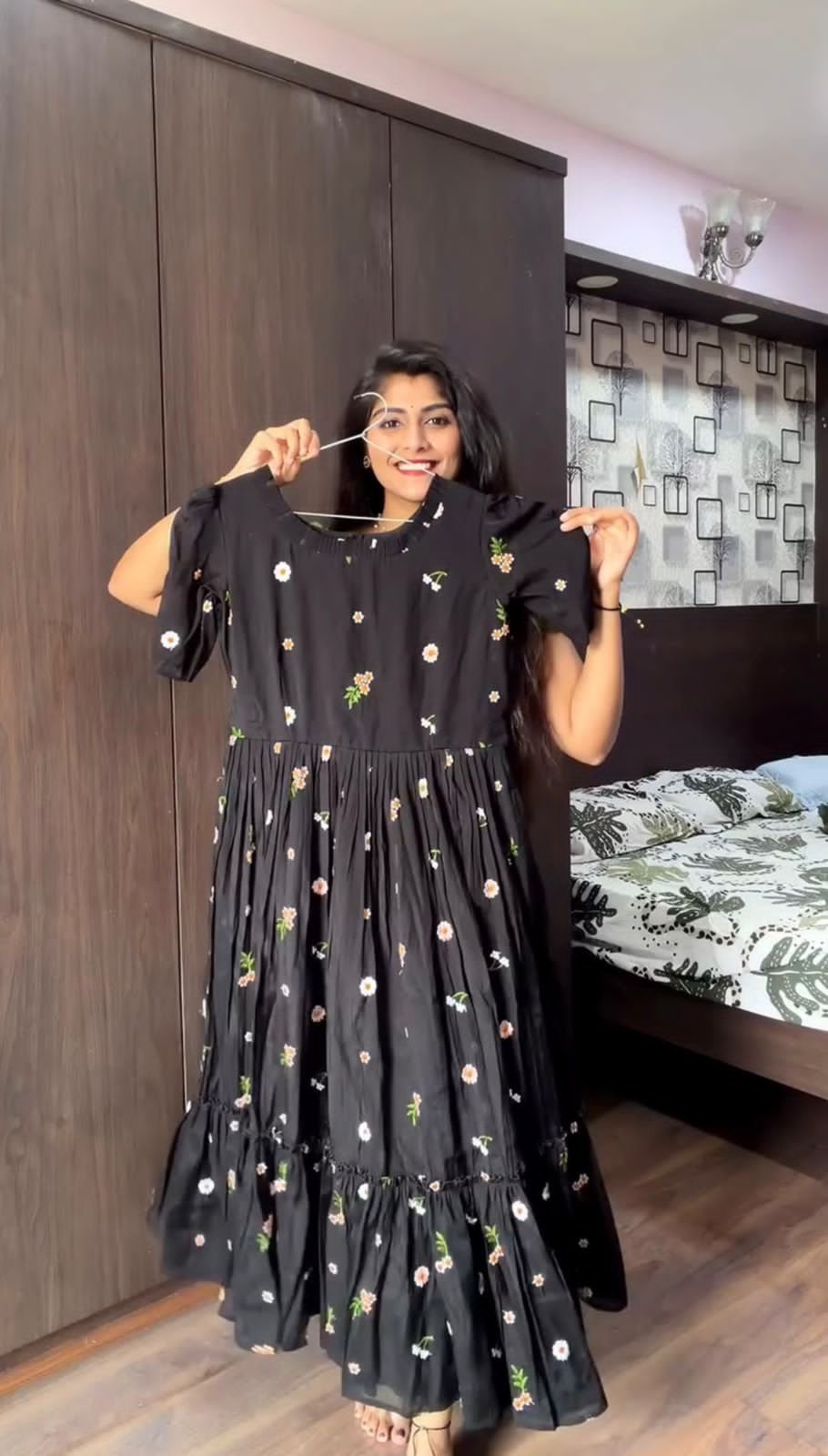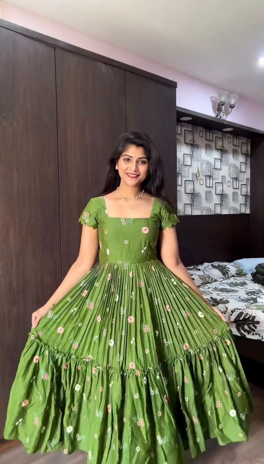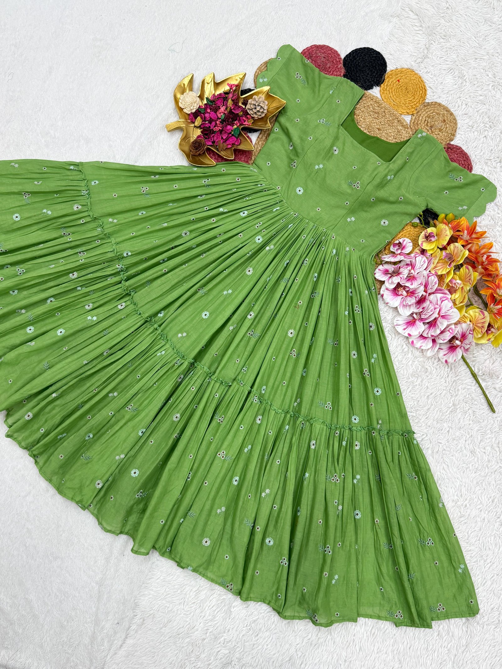 Detailed Artistry: Intricate floral thread embroidery on the bodice and skirt for a feminine, garden-fresh look.