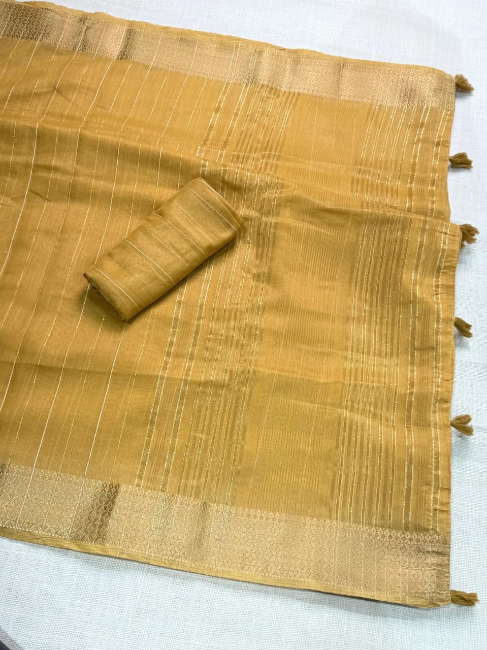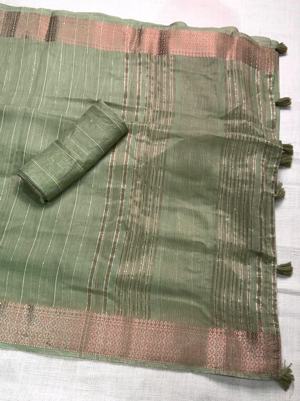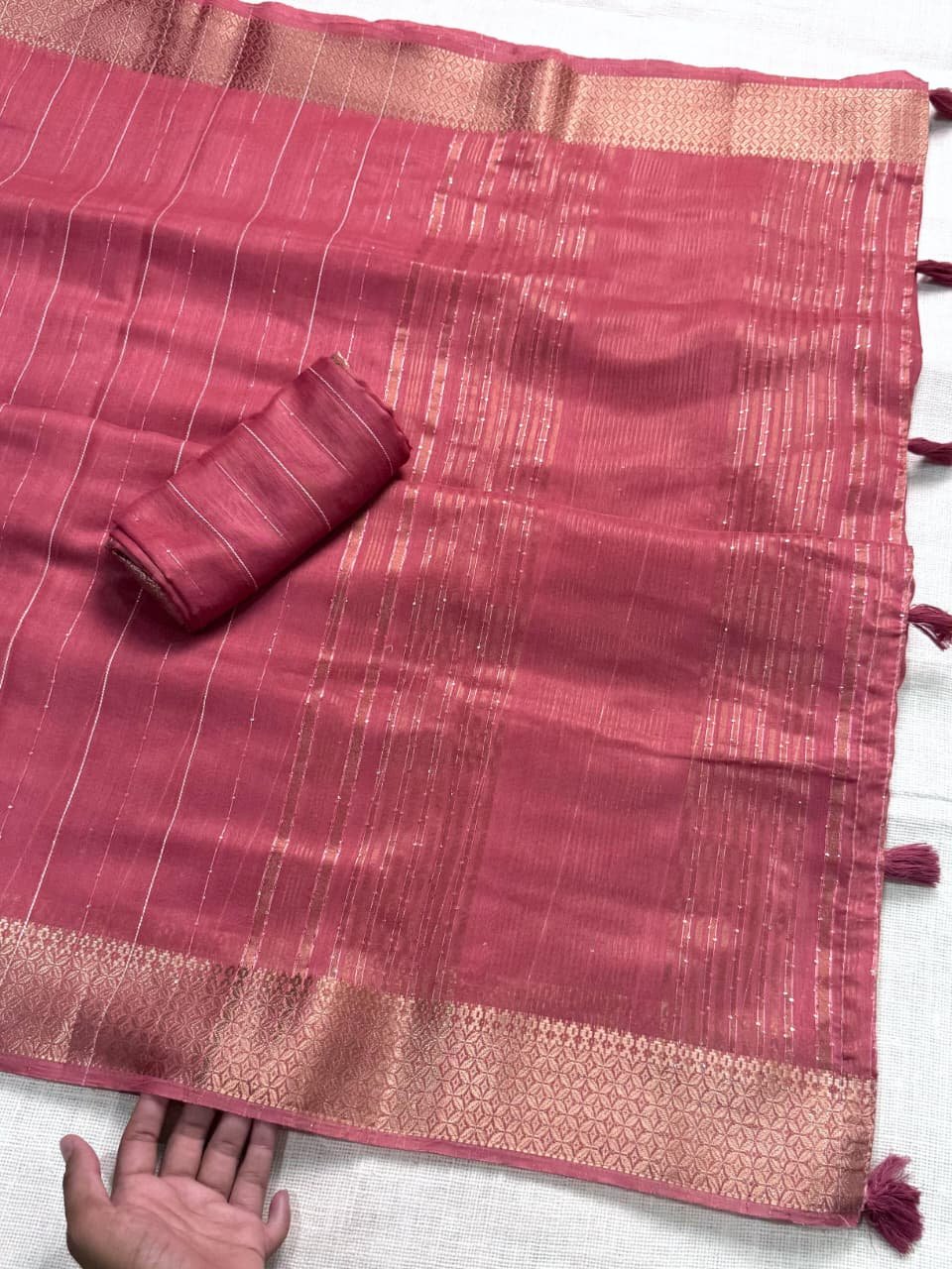 Jacquard Zari Weaving: The saree features a subtle yet elegant Zari weaved jacquard pattern throughout the body and pallu, adding a hint of shimmer to its solid-toned base.