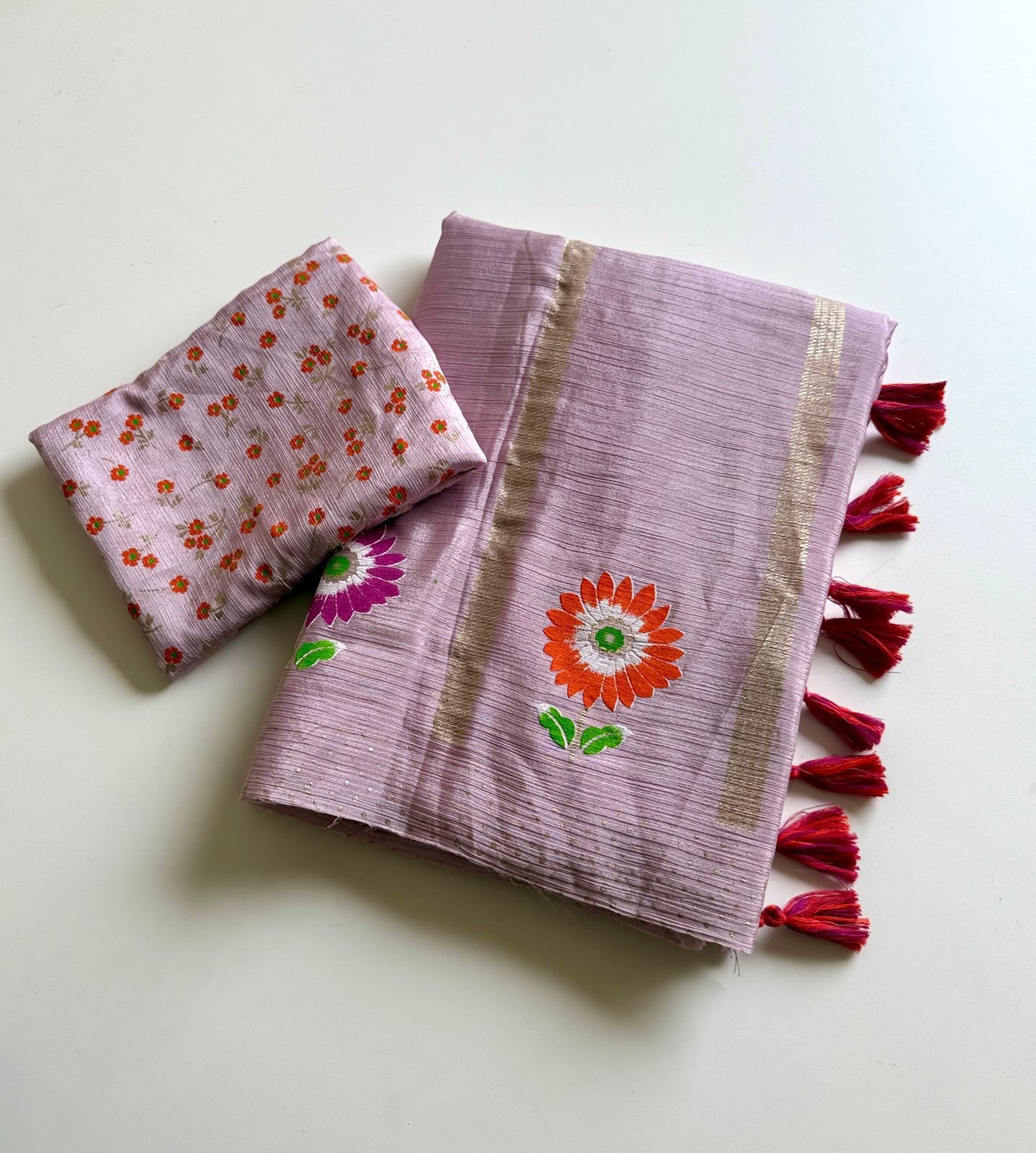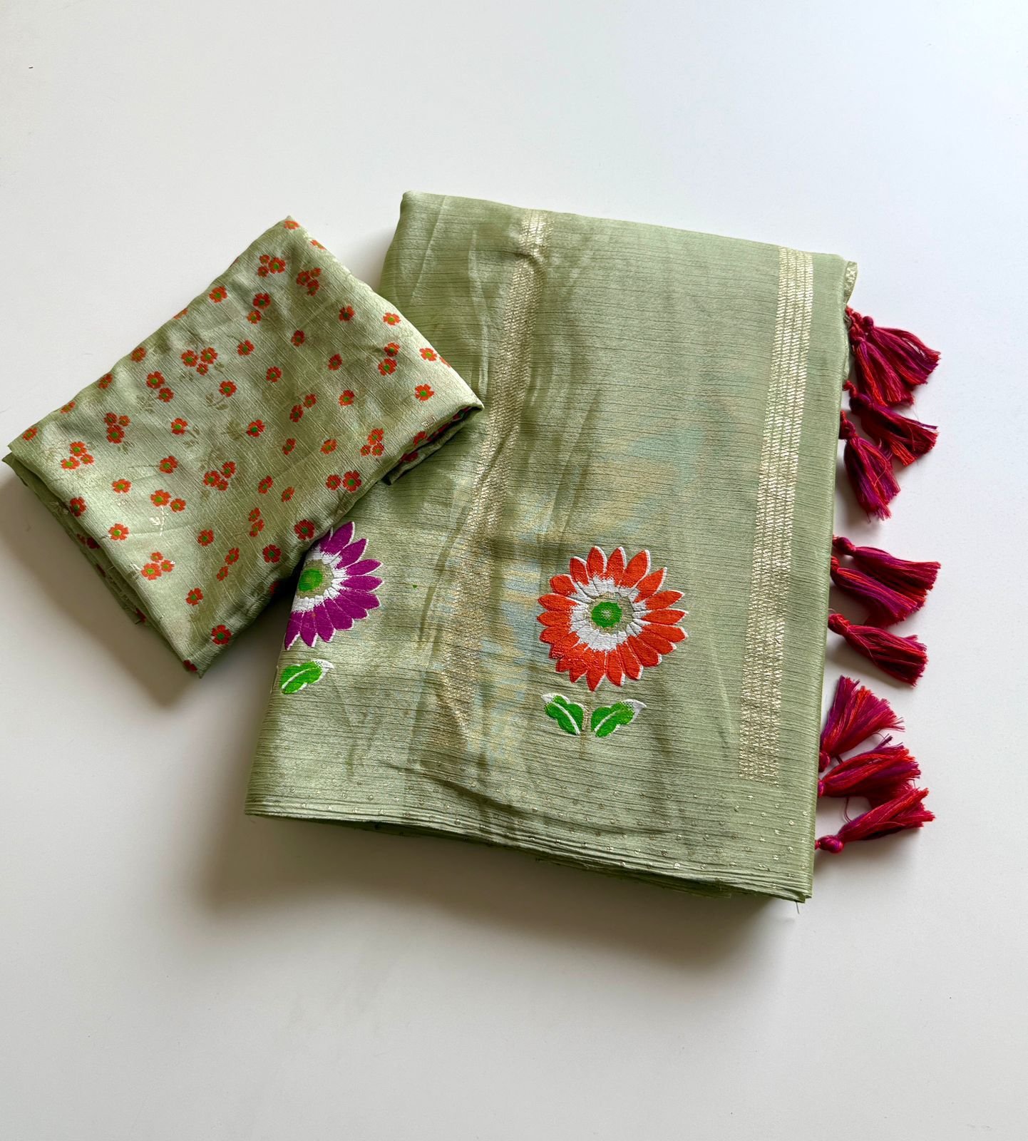 Designer Latkan Details: Each saree is finished with fancy latkans (tassels) on the pallu, adding a playful and charming movement to your look.