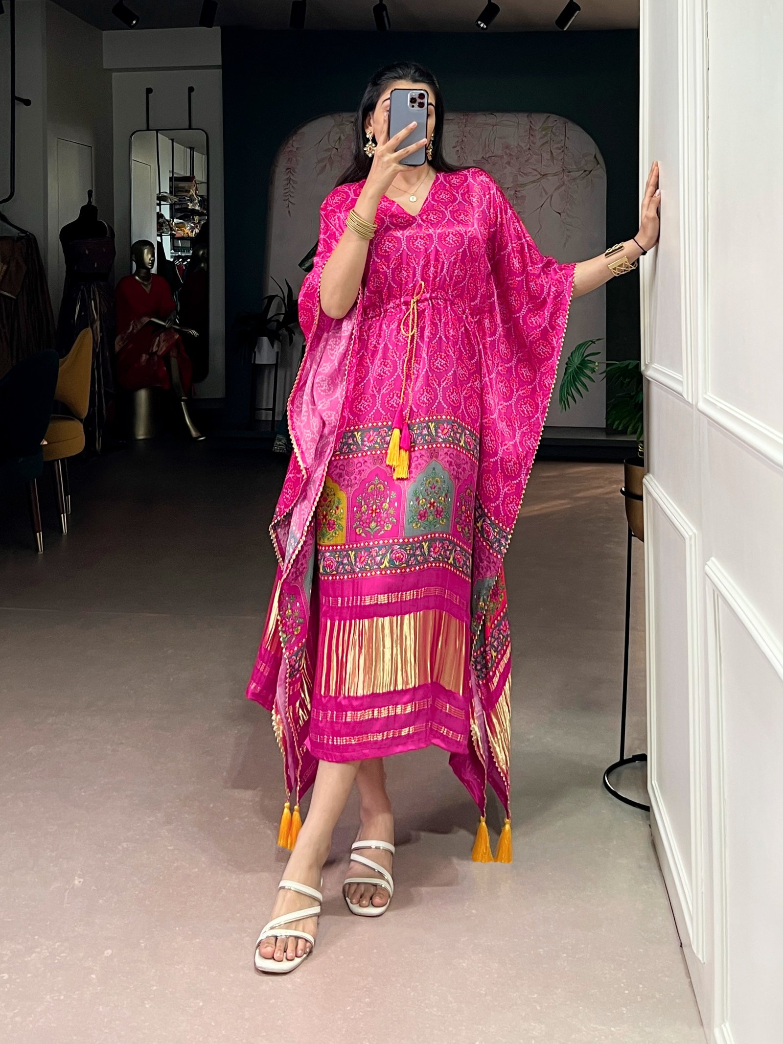 Made from pure Gaji Silk fabric, this kaftan feels soft, lightweight, and luxurious. It features a beautiful digital print design enhanced with Gotta Patti lace border and stylish tassels, giving the outfit a rich and graceful look.