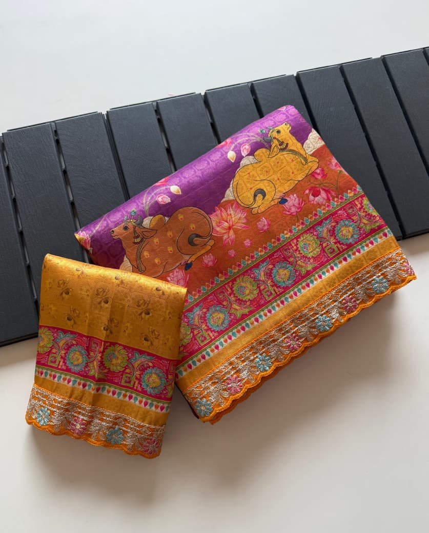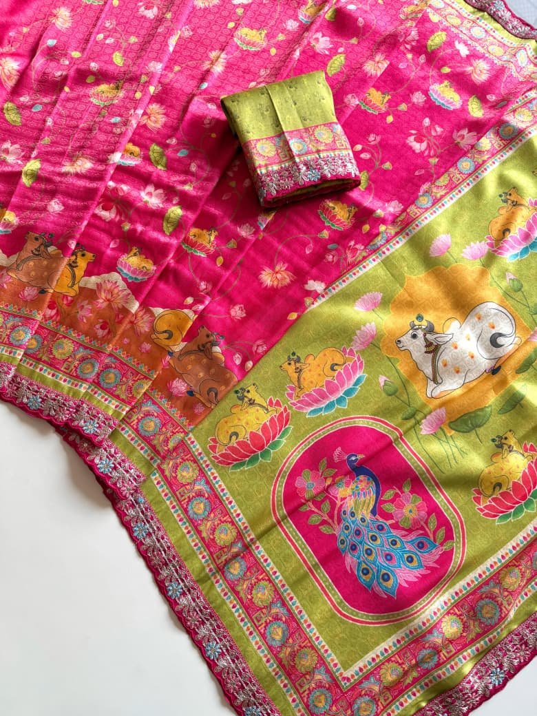 Enhance your ethnic collection with this beautiful Pure Dola Crepe Silk Designer Saree, crafted with luxurious full zari jacquard weaving for a rich and elegant look. The saree features digital Pichvai and Kalamkari style prints, combined with heavy coding sequence embroidery and cutwork lace fitting, making it perfect for weddings, festive occasions, and special celebrations.