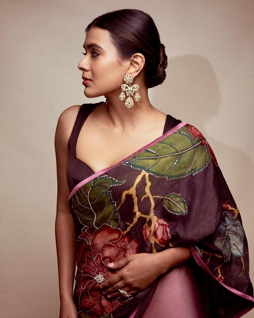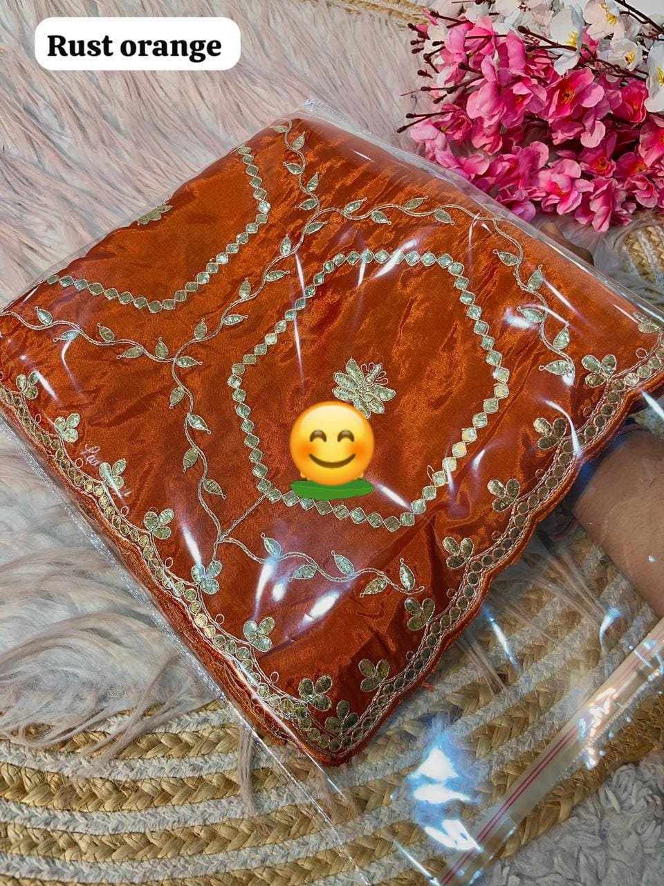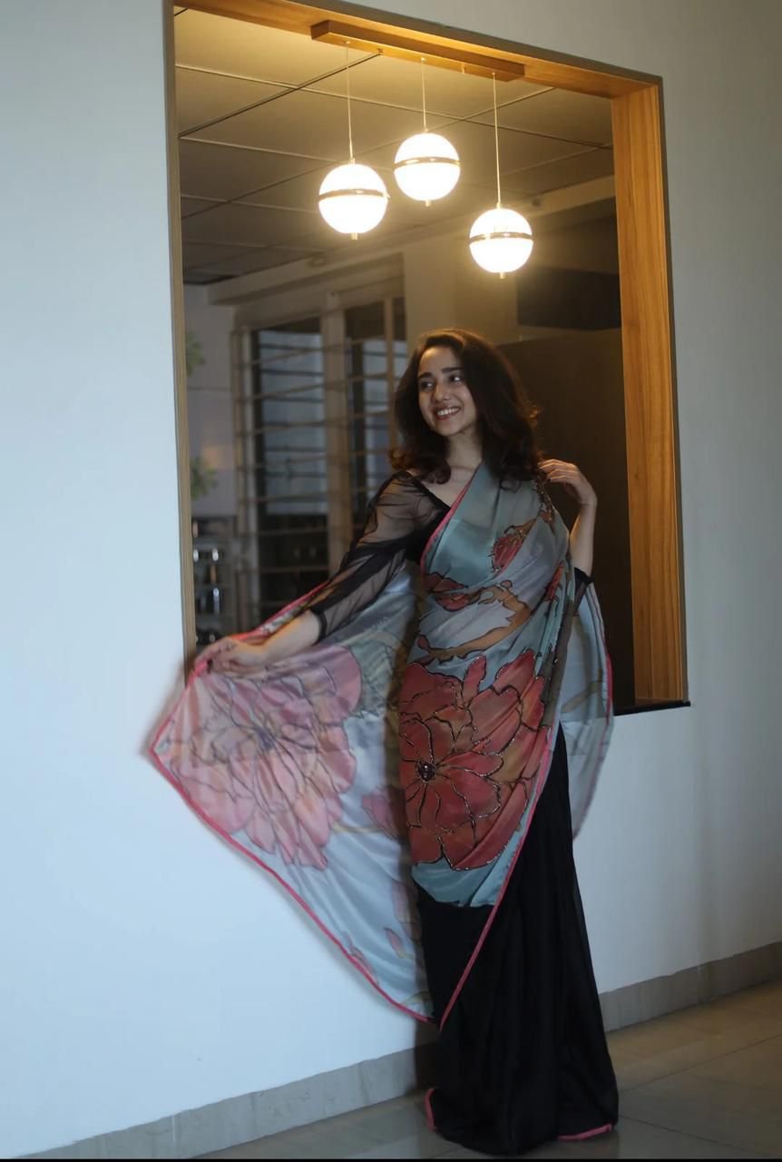 The saree features a stunning array of intricate embroidery paired with dazzling mirror work, creating a luxurious texture that feels both traditional and contemporary.